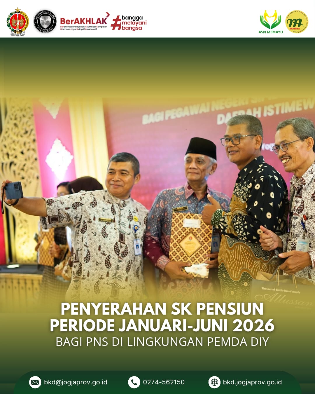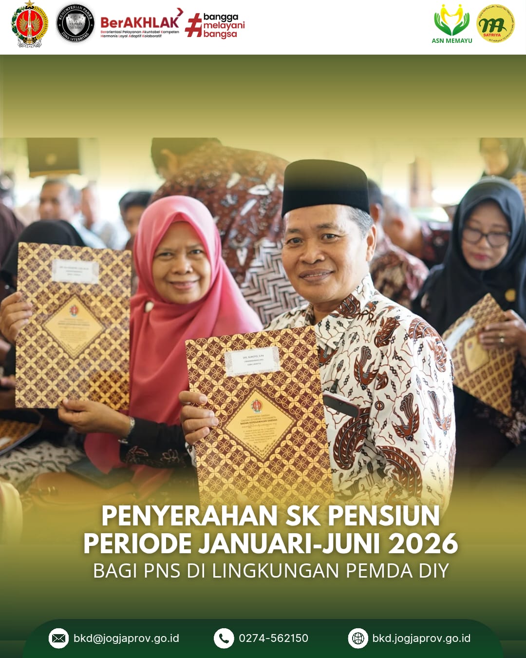 Yogyakarta, 11 Desember 2025 — Wakil Gubernur Daerah Istimewa Yogyakarta (DIY), KGPAA Paku Alam X (Sri Paduka), menyerahkan 274 Surat Keputusan (SK) Pensiun kepada para Pegawai Negeri Sipil (PNS) Pemerintah Daerah DIY yang memasuki masa purna tugas periode Januari hingga Juni Tahun 2026 pada Kamis, 11 Desember 2025. Acara penyerahan ini merupakan wujud apresiasi pemerintah daerah atas pengabdian para ASN.